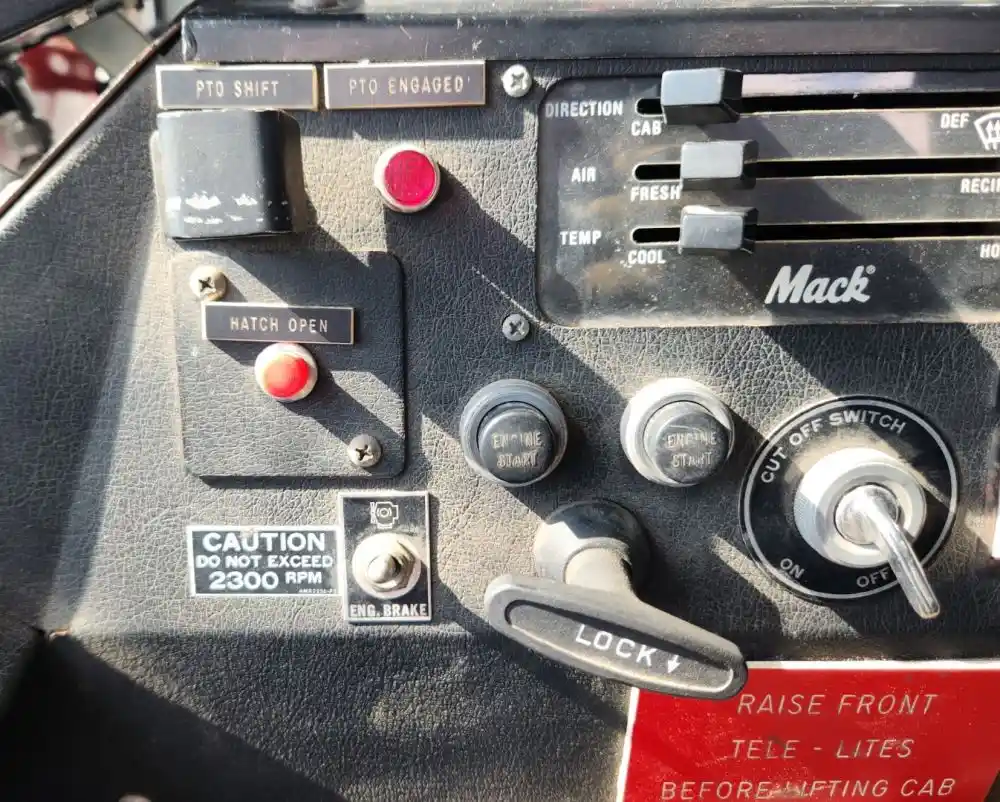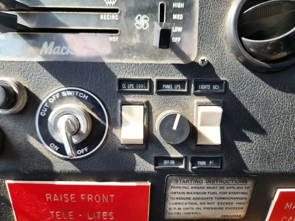 (Used) 1989 Mack MC688FC, MISCELLANEOUS DASH SWITCHES- Controls: PTO Shift, PTO Engage, Hatch Open, Eng Brake, Eng Start, Lock, Ignition Switch, CL Lps, Panel Lights, Headlights, Park Lights, Wiper Washer, Material: Aluminum and Plastic, Reference images for condition,