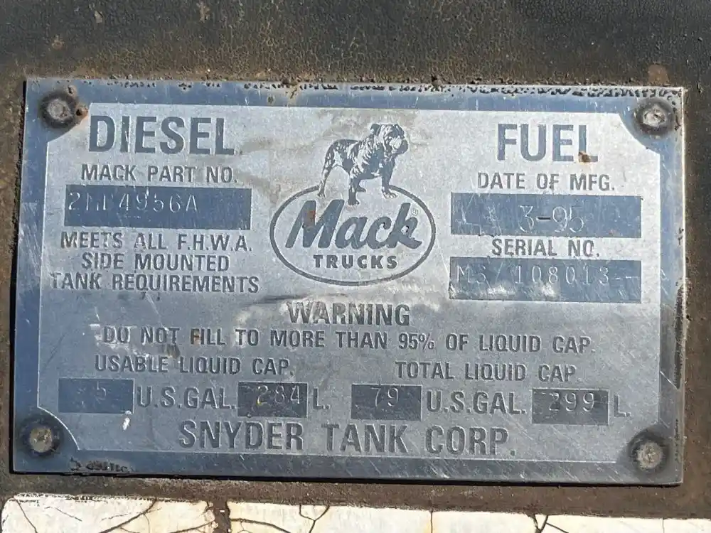 (Used) 1995 Mack RD688S, FUEL TANK- Part Number: 2MB4956A, Serial Number: MS108013, Side: Passenger Right Side, Material: Steel, Capacity: 75 Gallons, Shape: Round, Dimensions: L=42.5”, D=24”. Reference images for condition, For more information about this item, give us a call. ,