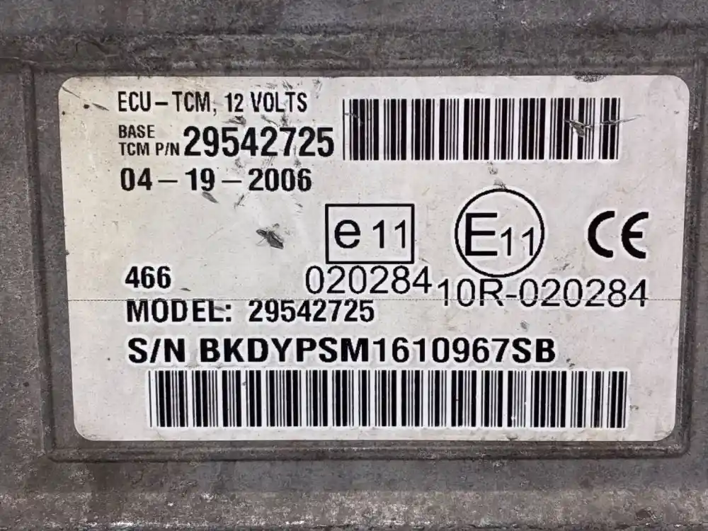 (Used) 2006 Allison 1000, TRANSMISSION ECM- Part Number: 29542725, Serial Number: BKDYPSM1610967SB, ECU-TCM; 12 VOLTS, TCM002K9, E 11, 10R-020284, 2 Rectangular Plug with 32 Pins each, Reference images for condition. ,