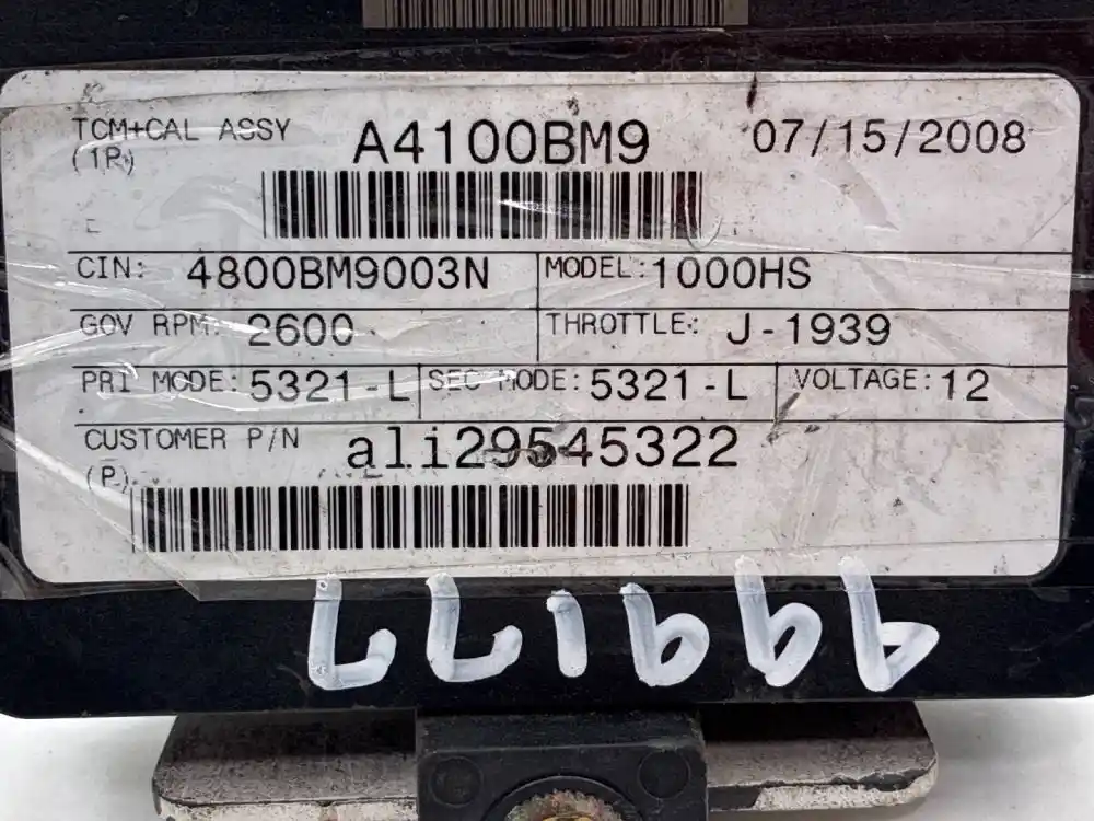 (Used) 2008 Allison 1000HS, TRANSMISSION ECM- Part Number: 29545536, Serial Number: BK5322N18122ETG2, 12 Volts A51003V1, CIN: 4800BM9003N, GOV RPM: 2600, THROTTLE: J--1939, PRI MODE: 5321- L, SEC MODE: 5321- L, E11, 032849, 10 R 022849, Supplier Number: ATA4103 MODEL: A41, Plug Pins: 80 Pins Plug Rectangular, Reference images for condition. ,