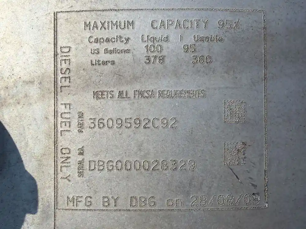 (Used) 2009 International Prostar, FUEL TANK- Serial Number: DBG000028329, Part Number: 3609592C92, Side: Driver Side, Capacity: 100 Gallons, Material: Aluminum, Shape: Cylinder, Dimensions: Length=46.5”, Height=26", Reference images for condition, ,