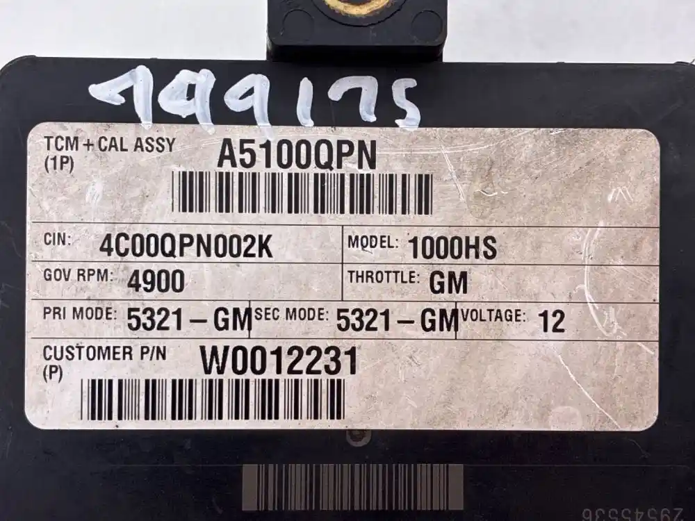 (Used) 2011 Allison 2100-2200HS , TRANSMISSION ECM- Part Number: 29545536, Serial Number: BK5536N11129015E, 12 Volts A5100QPN, CIN: 4C00QPN002K, GOV RPM: 4900, THROTTLE: GM, PRI MODE: 5321- GM, SEC MODE: 5321- GM, CUSTOMER PIN: W0012231, E11, 032849, 10R022849, Supplier Number: ATA5101, Plug Pins: 80 Pins Plug Rectangular, Reference images for condition. ,