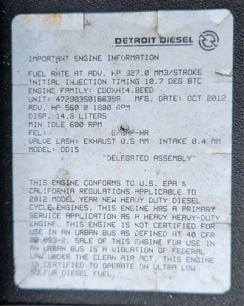 (Used) 2012 Detroit DD15, ENGINE ASSEMBLY- Family Number: CDDXH14.8EED, Displacement: 14.8L, Horsepower: 560, Serial Number: 472903S0166398,