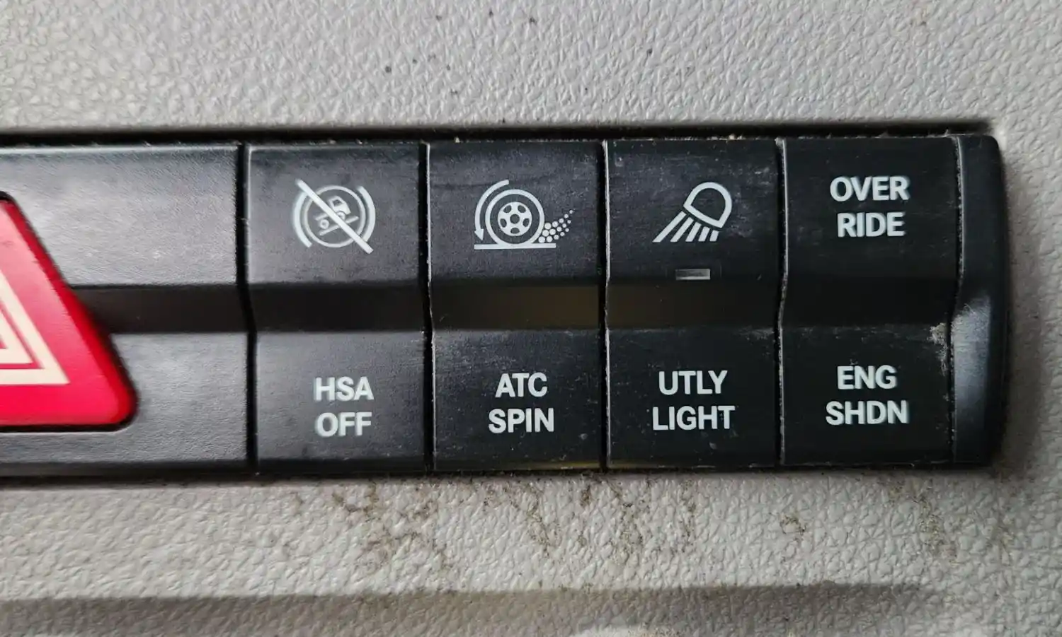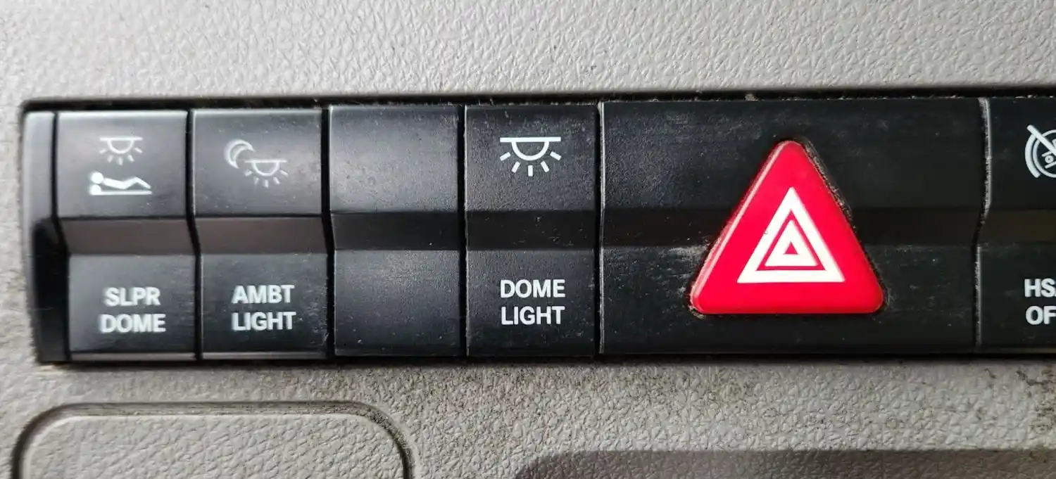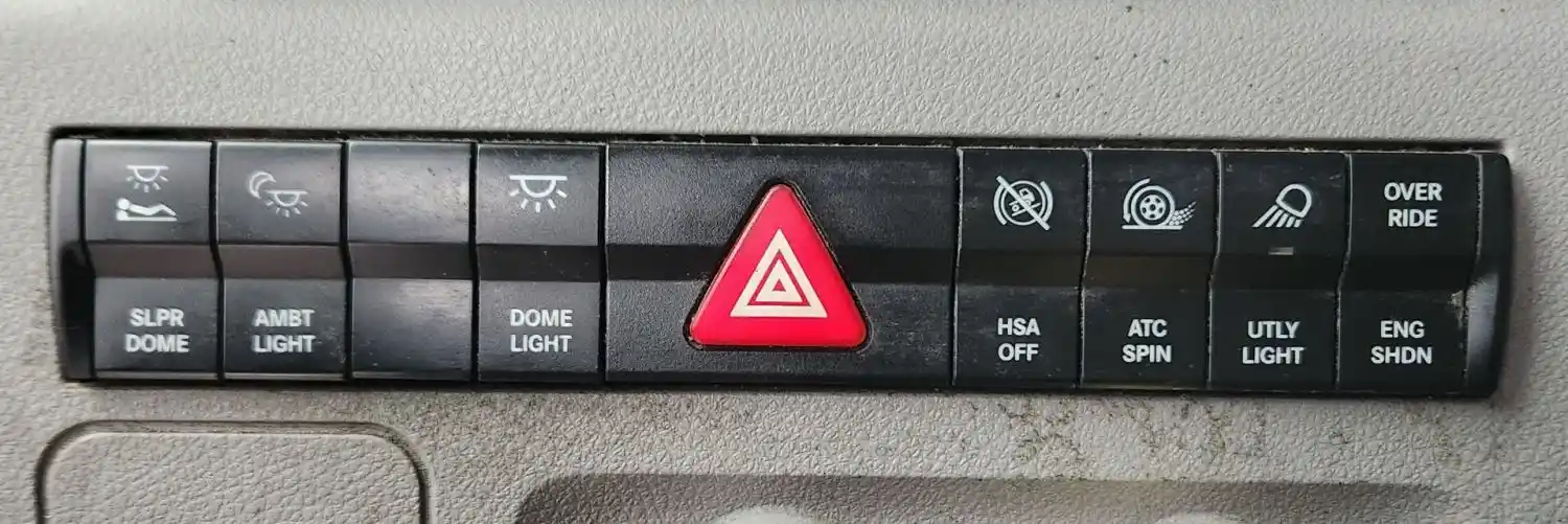 (Used) 2019 Freightliner Cascadia 126, MISCELLANEOUS DASH SWITCHES- Controls: Sleeper Dome, Ambt Light, Dome Light, Hazard Lights, HSA Off, Atc Spin, Utly Light, Override-Eng Shdn, Material: Plastic, Reference images for condition,