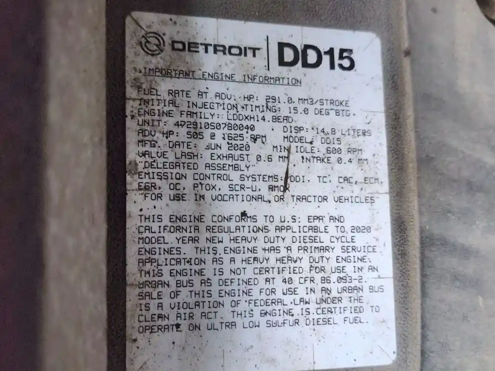(Used) 2020 Detroit DD15, ENGINE ASSEMBLY- Family Number: LDDXH14.8EAD, Displacement: 14.8L, Horsepower: 505, Serial Number: 472910S0780040, Part Number: C01-00287-143, ECS: DDI, TC, CAC, ECM, EGR, OC, PTOX, SCR-U, AMOX,