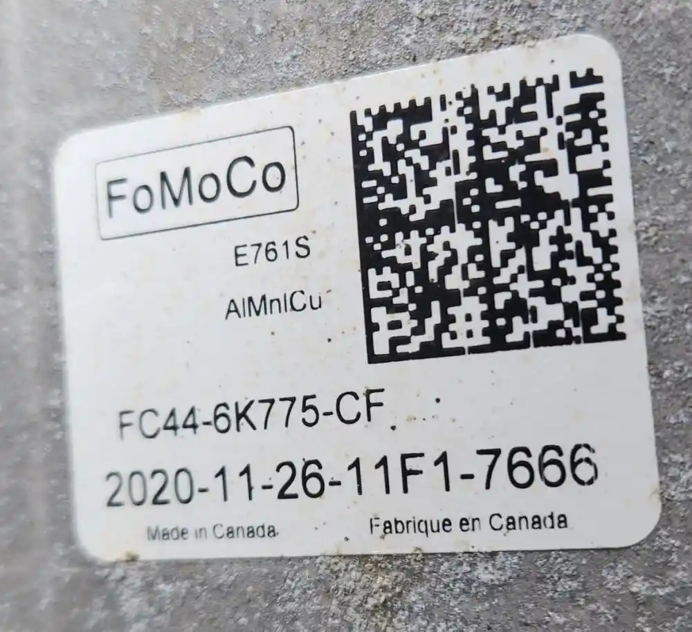 (Used) 2021 Ford F-750, INTERCOOLER TURBO AIR- Part Number: FC44-6K775-CF, Engine: Ford 4V F-Series, Material: Aluminum, Dimensions: L=12", H=10 ½", Reference images for condition,