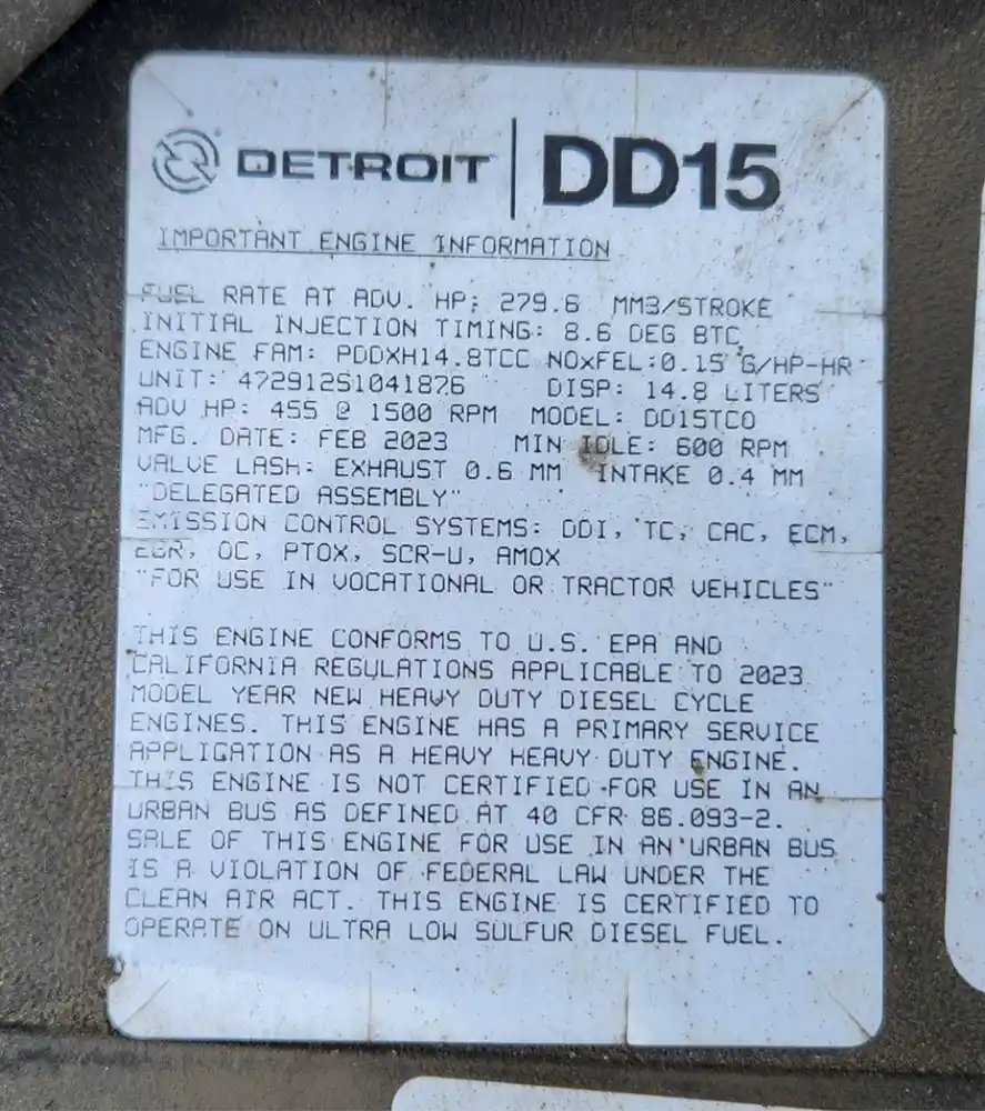 (Used) 2023 Detroit DD15, ENGINE ASSEMBLY- Family Number: PDDXH14.8TCC, Displacement: 14.8L, Horsepower: 455, Serial Number: 472912S1041876, E.C.S: DDI, TC, CAC, ECM, EGR, OC, PTOX, SCR-U, AMOX,