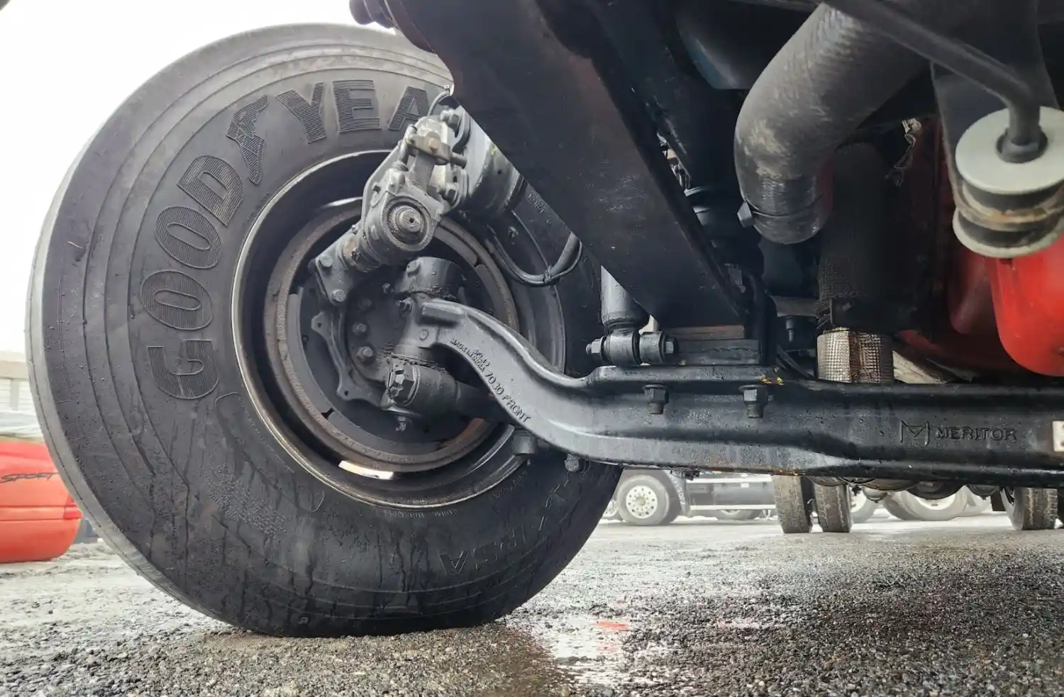 (Used) 2025 International MV607, COMPLETE FRONT AXLE- Part Number: 100000002, Serial Number: MON05608465, Center Leaf to Center Leaf: 32", Make: Meritor, Model: MFS12122ANN70, Capacity: 12,000 Lbs, Hub Bolts: 10, Brake Type: Drum,